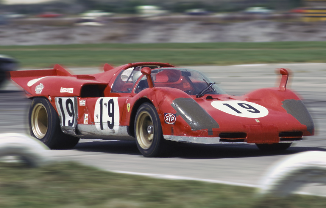 In the second race against the Gulf 917 Porsches, Ferrari hoped the rough Sebring airport course would prove to be an equalizer. Initially, it was, as Andretti took his 512 into an immediate lead and held it until 9 pm. He would go on to victory in what he called “one of my most satisfying wins” in another 512. Here he is coming through the final turn before entering the Pit Straight. Note the overall condition of the bodywork – this is only the second race for this car and already it is showing its scars. I chuckle today when I see racecars from this era at concours, with their mirror-like finish and perfect details.
